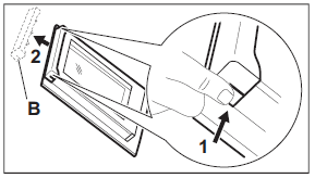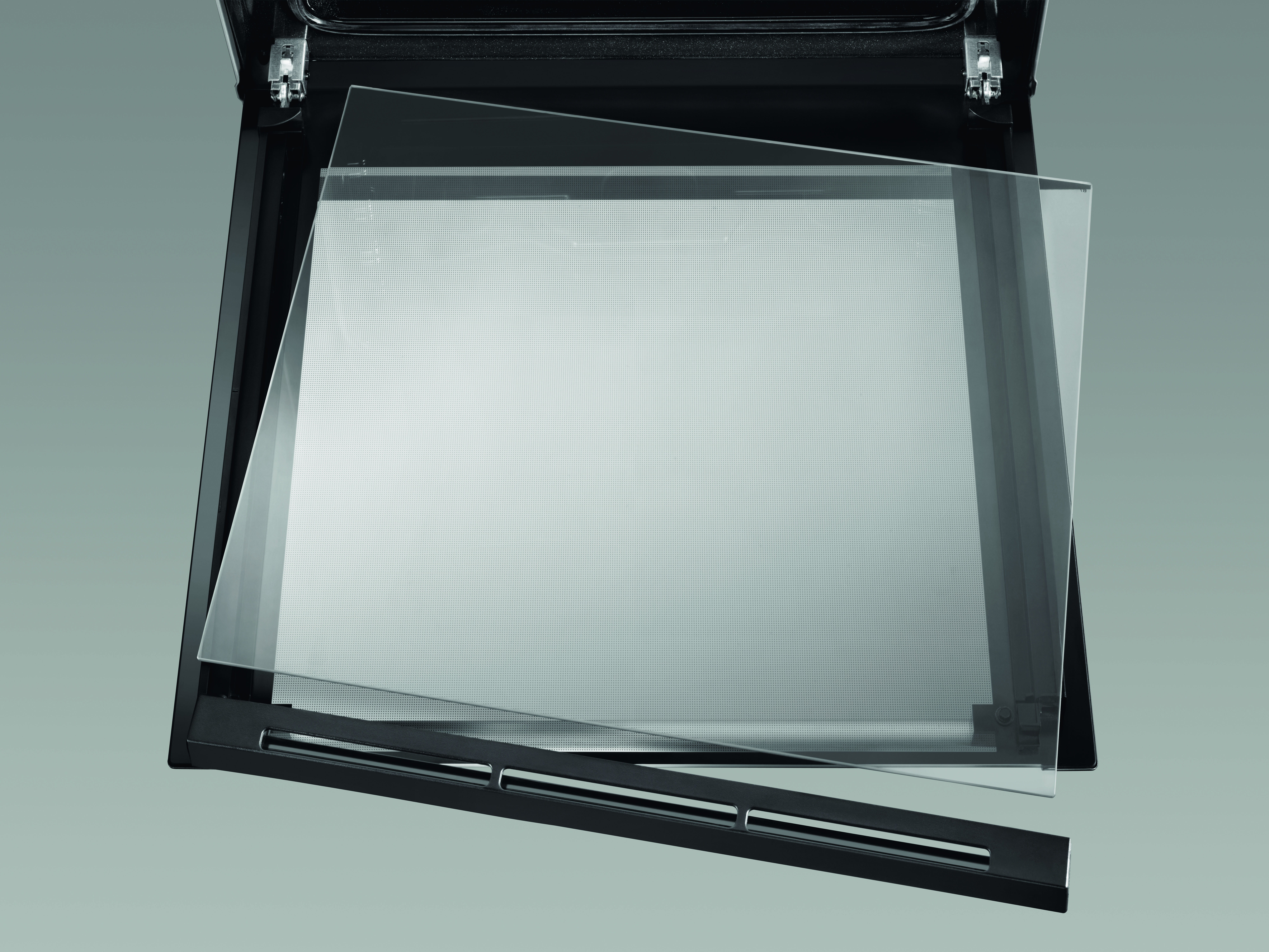Glass is removed by releasing the plastic strip at the top of the oven door which secures the glass in place. Textured markings on either side of the plastic strip indicate where to apply pressure and a pull towards you. This will release the strip and give you access to the individual glass panes.