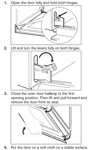 Follow the instructions in the images below to remove the door from the oven. Repeat the instructions in reverse to put the door back on the oven.