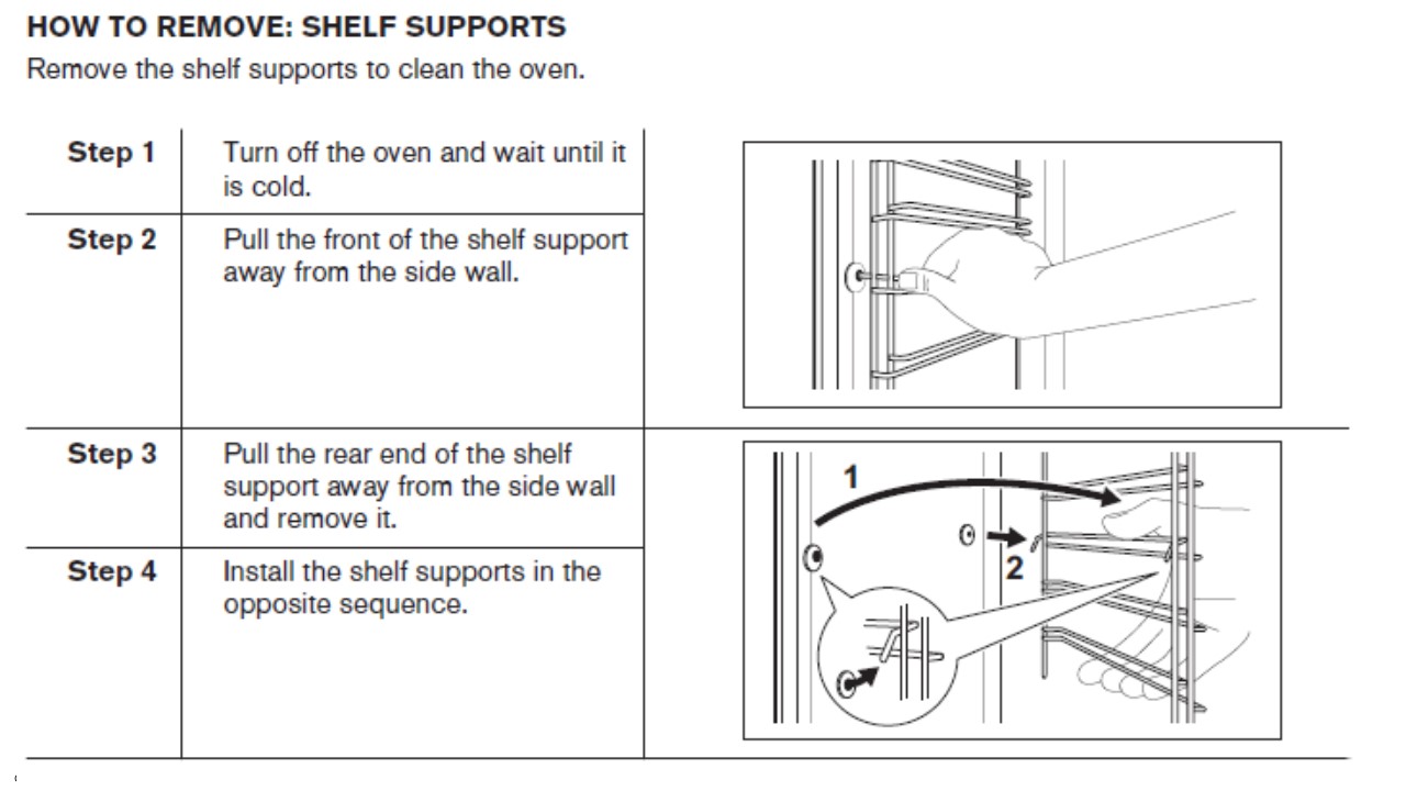 1. Remove oven trays, wire shelves and the pop-off shelf supports on each side and soak them in the sink or wash in the dishwasher.